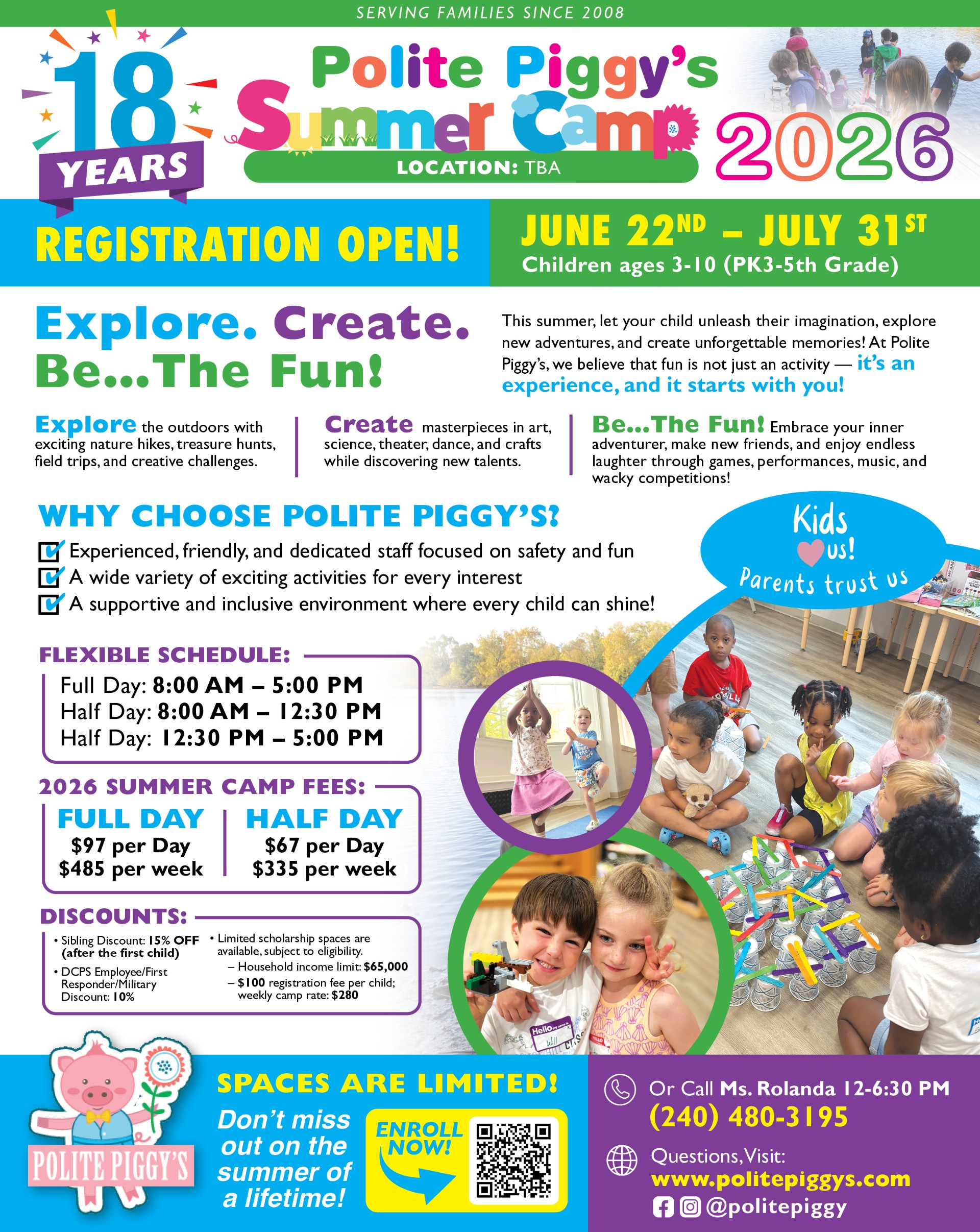 Refunds: 50% refund for any weeks/days canceled by email sent only to politepiggysinfo@gmail.com by 5/31/2026 at 11:59 pm. Cancellations can only be accepted by email. There are no credits for missed days or inclement weather days.